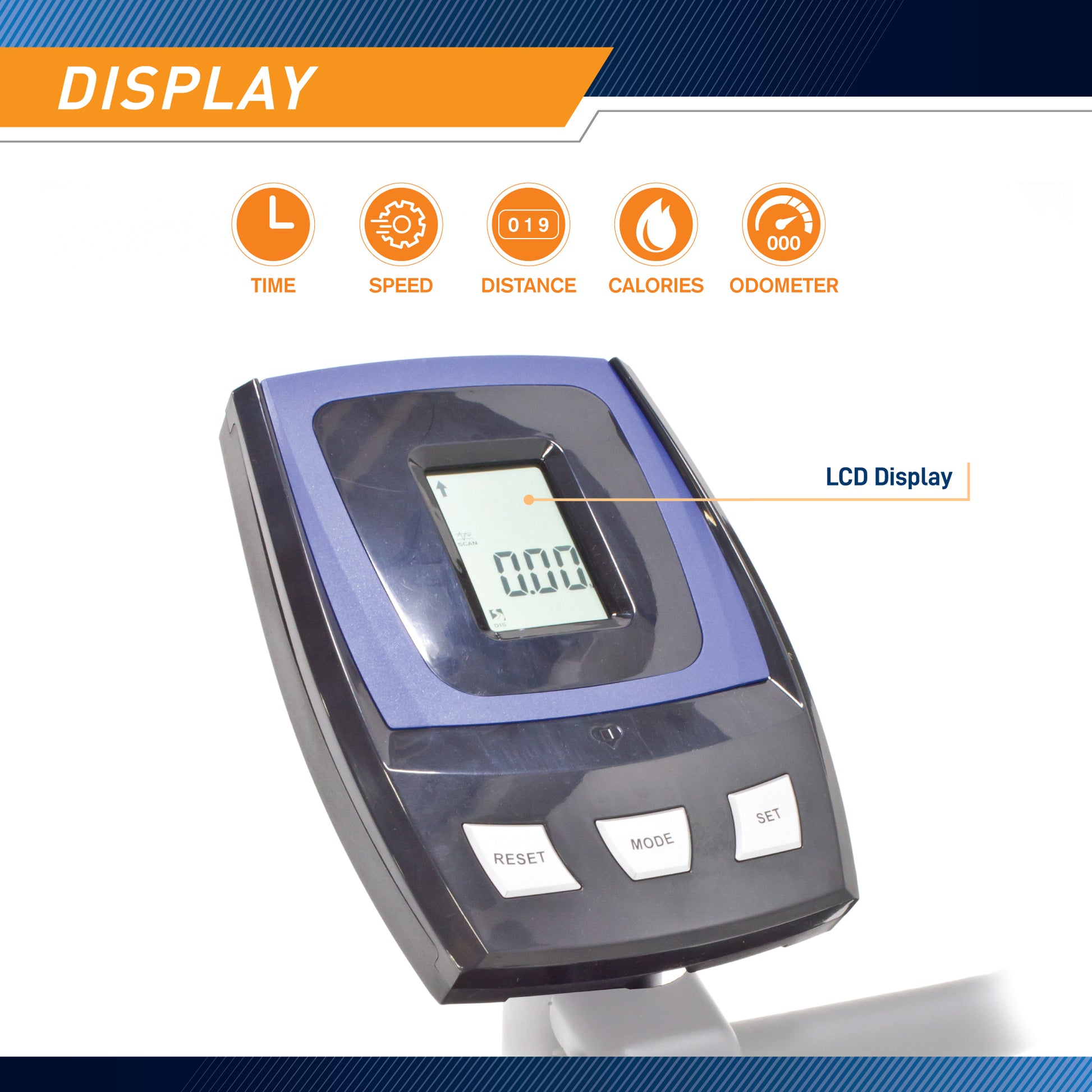Easy-to-read computer screen displays scan, speed, distance, time, odometer, and calories burned with a single button touch.